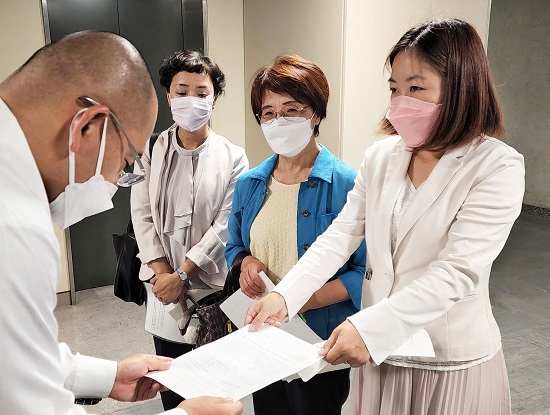 県にコロナ対策強化を求める(右から)しもおく、わしの両予定候補=7月28日、愛知県庁