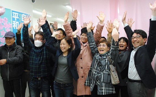 大勢が判明した9日深夜、下奥氏は集まった支援者とともに喜びを分かち合い、「若い人の反応が日に日に強くなり、SNSや『折り入って作戦』、JCPサポーターが大きな力になった」と強調。「学ぶことをあきらめなくていい教育、誰もが輝けるジェンダー平等の社会を実現する。大企業奉仕、大型開発優先の大村県政にモノを言う日本共産党としての役割を果たし、県民の思いを受け止め全力を尽くす」と話しました。本村伸子衆院議員も駆け付け一緒に万歳しました。