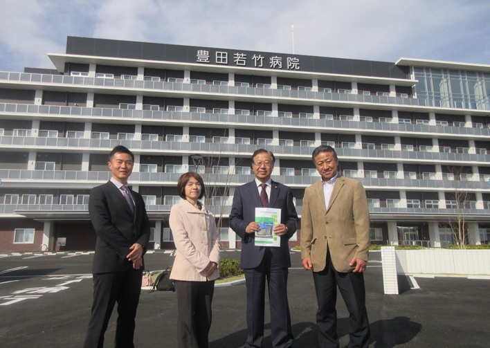 4月に開院した豊田若竹病院を視察する日本共産党の(左から)本多のぶひろ豊田市議予定候補、根本みはる豊田市議、大村よしのり豊田市議(県議予定候補)、牧田みつおみよし市議(写真提供=大村市議)