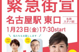 本日、国会が解散される予定です。解散を受けて、緊急街宣を行います。 【日時】1月23日(金)17:30~【場所】名古屋駅東口名鉄スタバ前【弁士】もとむら伸子(東海比例)、すやま初美(東海比例)、えがみ博之(愛知5区)配信も行う予定です。https://www.youtube.com/live/XANXW40LhOQ?si=FQnGYigTa7UQgOTZ