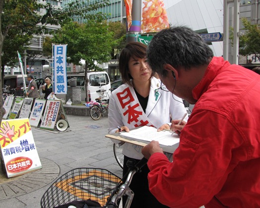 妻と一緒に署名した高齢の男性は「日本人にとって米はいのち。どんなことがあっても大切にしなくちゃいかん。政治家は一丸となって輸入自由化に反対すべきだ」と述べ、日本共産党に期待を寄せました。(10月27日)