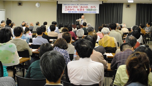 医師で日本被団協原爆被爆者中央相談所前理事長の肥田舜太郎氏(95)が「ヒロシマの『あの日』から『これから』を語る~被爆医師の証言」と題して講演しました。