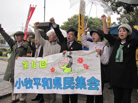 地元住民でつくる、「平和で住みよい小牧をつくる会」の赤塚一男代表は「民主党政権下でオスプレイの沖縄配備が強行されるなど、政権交替後も政治はひどくなる一方です。住民の安全は守れません。安保条約を廃棄し、基地のない平和な街を実現するためにがんばります」と決意を述べました。