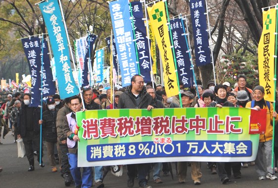 「小○こまる消費税8%、怒りの大集会」の参加者が集会後に行った市内4コースに分かれてデモ行進。「消費税増税中止」「原発再稼働はやめよ」などと書いた横断幕やプラカードを掲げた参加者の思いは―。