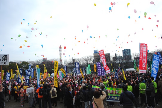 フィナーレは参加者が書いた安倍政権に対する「怒りのメッセージカード」を吊るした風船を晴れた大空に放ちました。