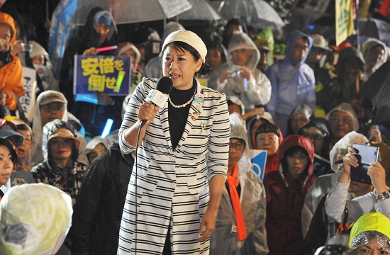 2015年9月17日。戦争法が強行される2日前の夜、国会前の抗議行動で、若者や野党議員とともに本村伸子衆院議員がマイクを握りました。
