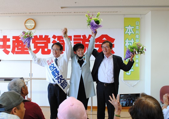 愛知県西尾市で27日、市議選(6月18日告示、25日投票)での議席増と都議選・総選挙の躍進めざし、もとむら伸子衆院議員を迎えた日本共産党演説会が開かれ、用意したいすが足らないほどの参加者で、熱気に包まれました。