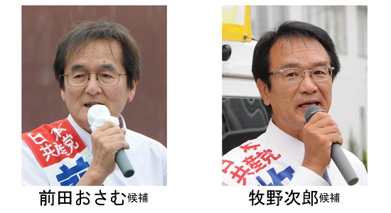 愛知県西尾市議選が18日告示(25日投票)され、日本共産党は前職の前田おさむ(61)、元職の牧野次郎(59)の両氏が第一声をあげました。定数30に有力35人が立候補する激戦です。