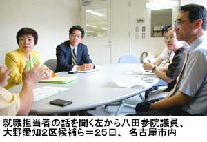 若年層の就職難の解決に取り組む、日本共産党の八田ひろ子参院議員らは25日、名古屋市内の私立大学を訪ね、就職担当者と懇談しました。同党の大野ひろみつ小選挙区愛知2区候補も同席しました。