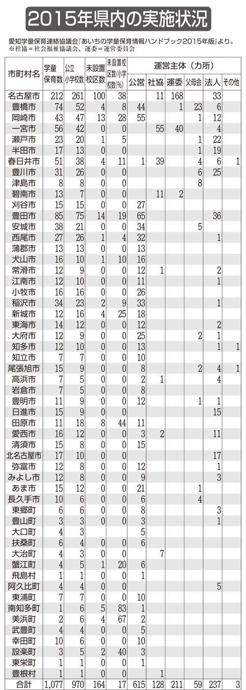 県内の学童保育所数は11年に小学校数を上回りましたが、164校区が未設置。県学童保育連絡協議会は、小学生の生活圏から見て、小学校区に1カ所の学童保育所の設置が必要としています。