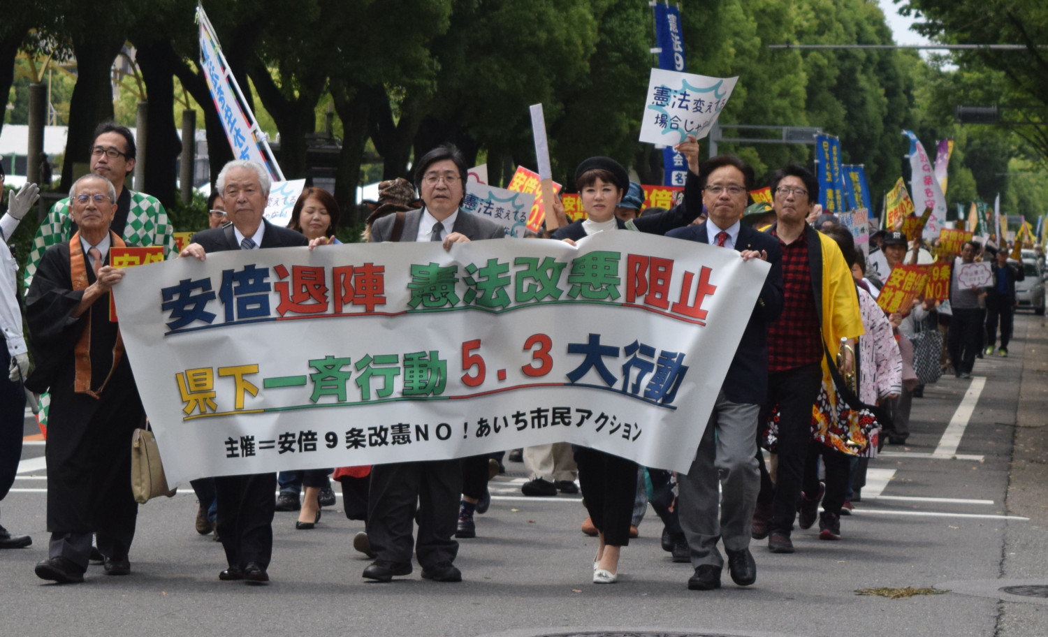 憲法9条改悪反対、安倍内閣総辞職を訴えて行進する安倍9条改憲NO!あいち市民アクションの人たち=3日、名古屋市中区