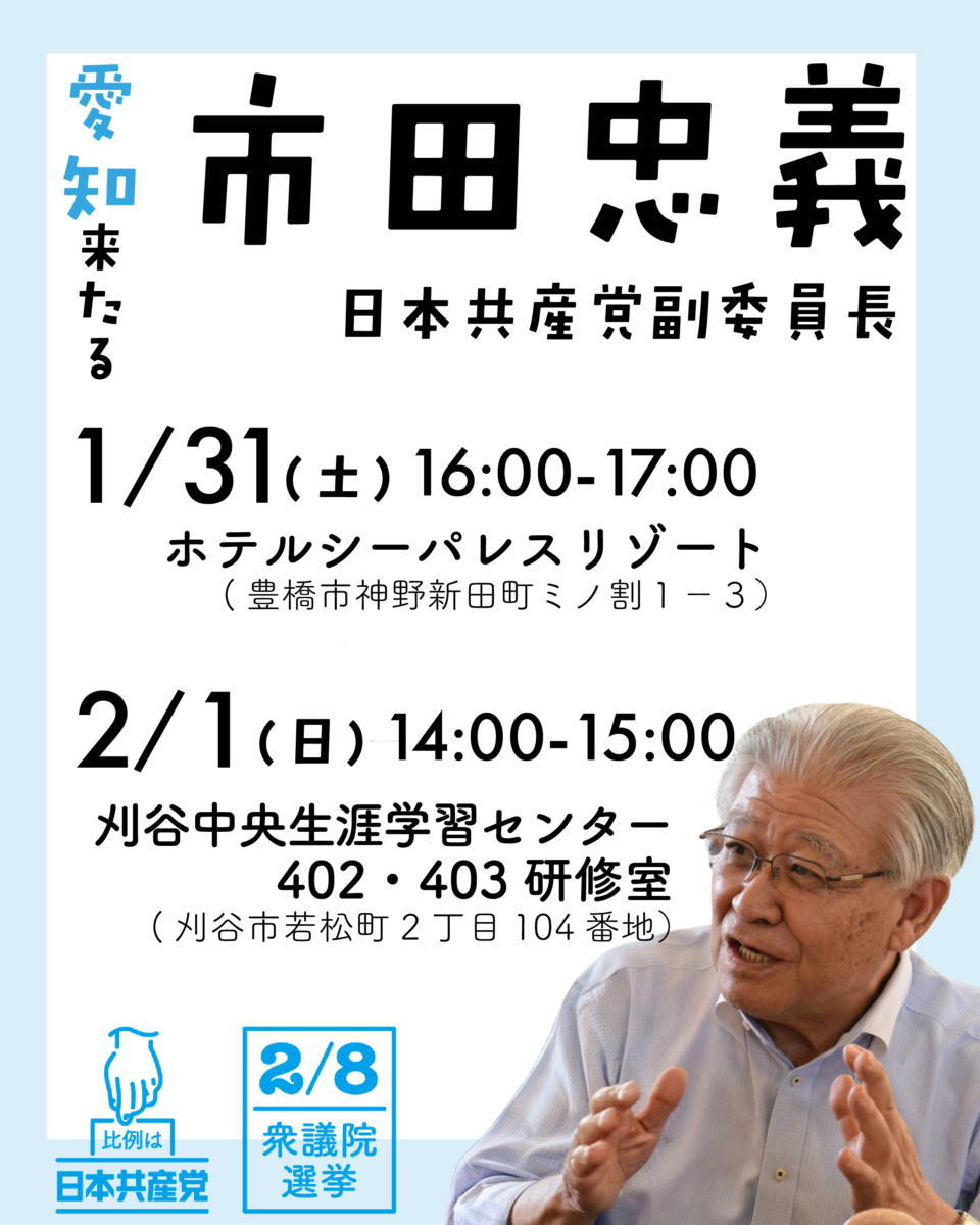 検索: 2026年1月30日 選挙情報・ニュース・演説会 市田副委員長来たる 2026年1月30日 選挙情報・ニュース・演説会 【演説会】田村智子来たる! 2026年1月29日 選挙情報・ニュース・演説会 憲法を真ん中にした共同をすすめる日本共産党 政党演説会 2026年1月29日 選挙情報・ニュース 原発ゼロの日本を 2026年1月28日 選挙情報・ニュース 社民党愛知県連合と相互推薦を決定 2026年1月27日 選挙情報・ニュース・演説会 衆議院選挙1日目すやま初美比例候補の予定(愛知県内) 2026年1月27日 選挙情報・ニュース・演説会 衆議院選挙1日目もとむら伸子候補の予定 2026年1月24日 ニュース 志位和夫来たる! 2026年1月22日 ニュース・演説会 緊急街宣 2026年1月22日 選挙情報・ニュース 小選挙区予定候補発表 2026年1月21日 ニュース 1/23すやま初美Instagram Live! 2026年1月17日 選挙情報・ニュース 衆院比例予定候補発表 さらに表示